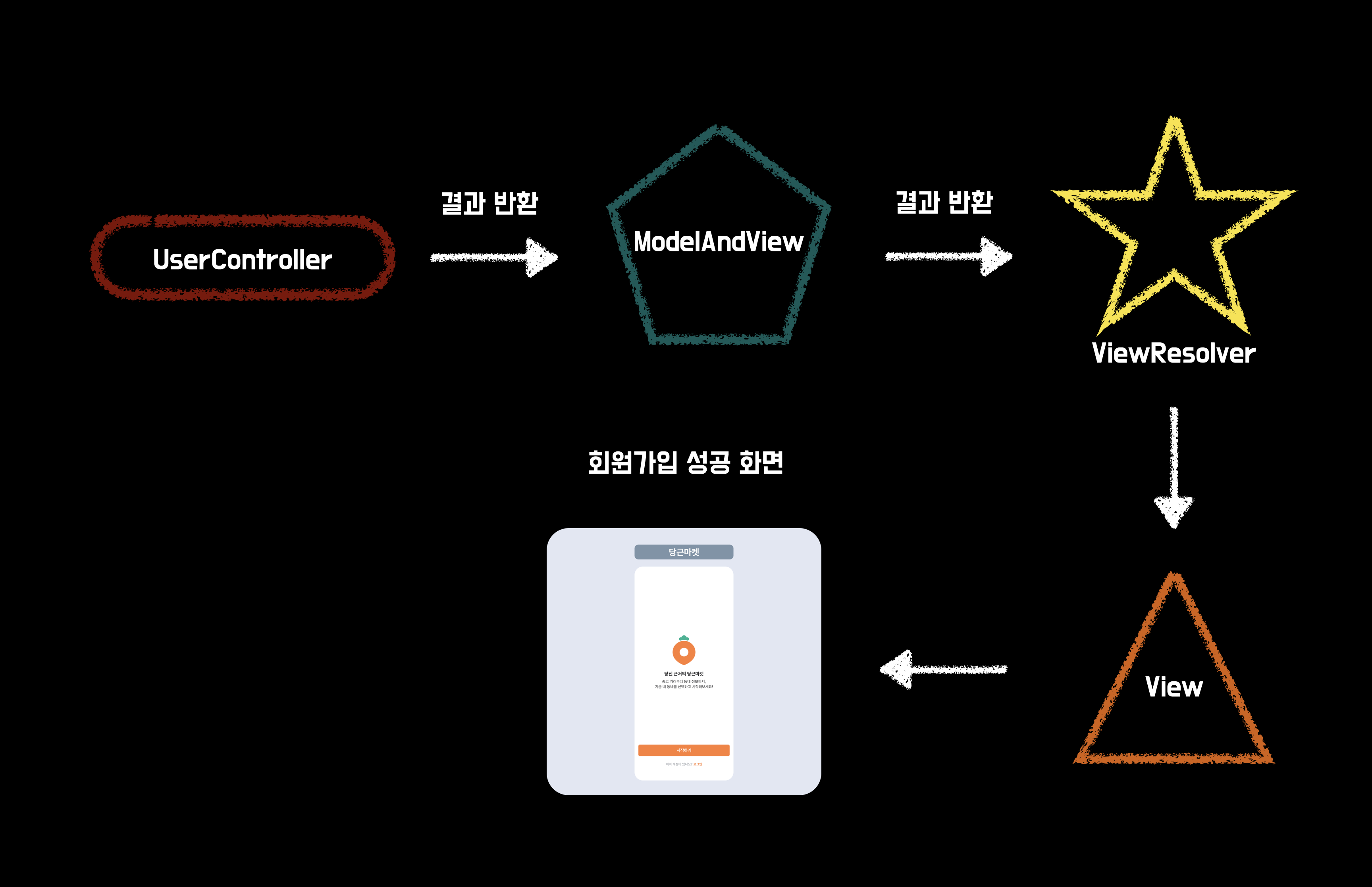 이 다음은 Controller 차례다. 회원가입 요청을 받은 UserController는 그에 맞는 처리를 하고 결과를 돌려준다. Dispatcher Servlet에 바로 돌려주는 것이 아닌 ModelAndView라는 객체에 결과를 준다.