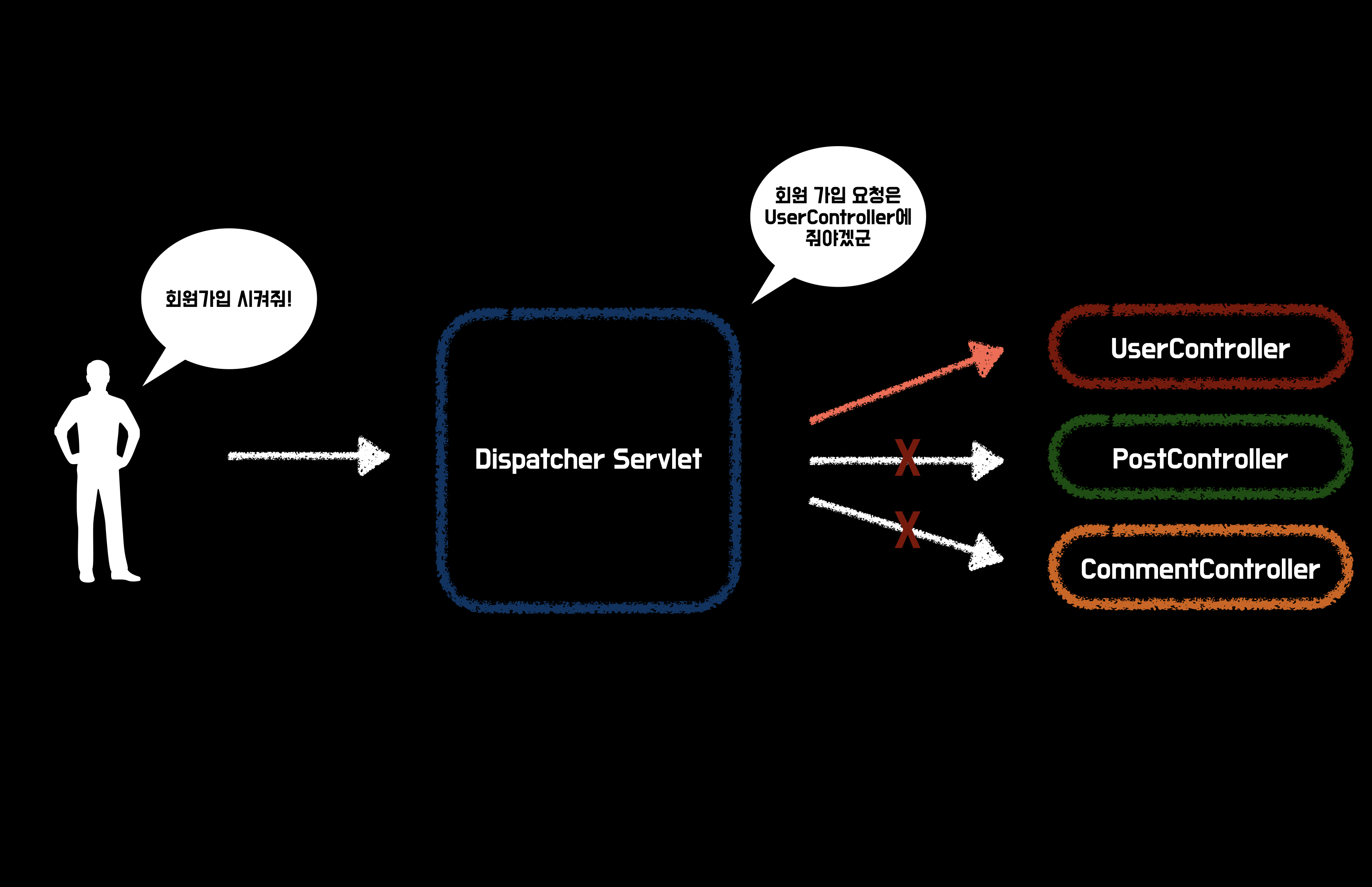 우선 애플리케이션으로 들어오는 Request를 받는 역할을 Dispatcher Servlet이라는 컴포넌트가 처리한다. 이름 그대로 Dispatcher(분배)라는 뜻을 지니고 있기 때문에 요청을 각 컨트롤러에 분배하는 역할로 생각하면 좋다.