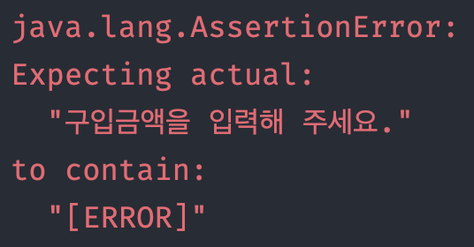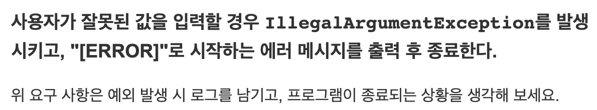 이 부분 정말 많이 헤맸던 것 같다. 우테코에서 제시한 바로, 예외상황에서는 IllegalArgumentException을 던지고 "[ERROR]" 메시지를 포함하라고 했었다.