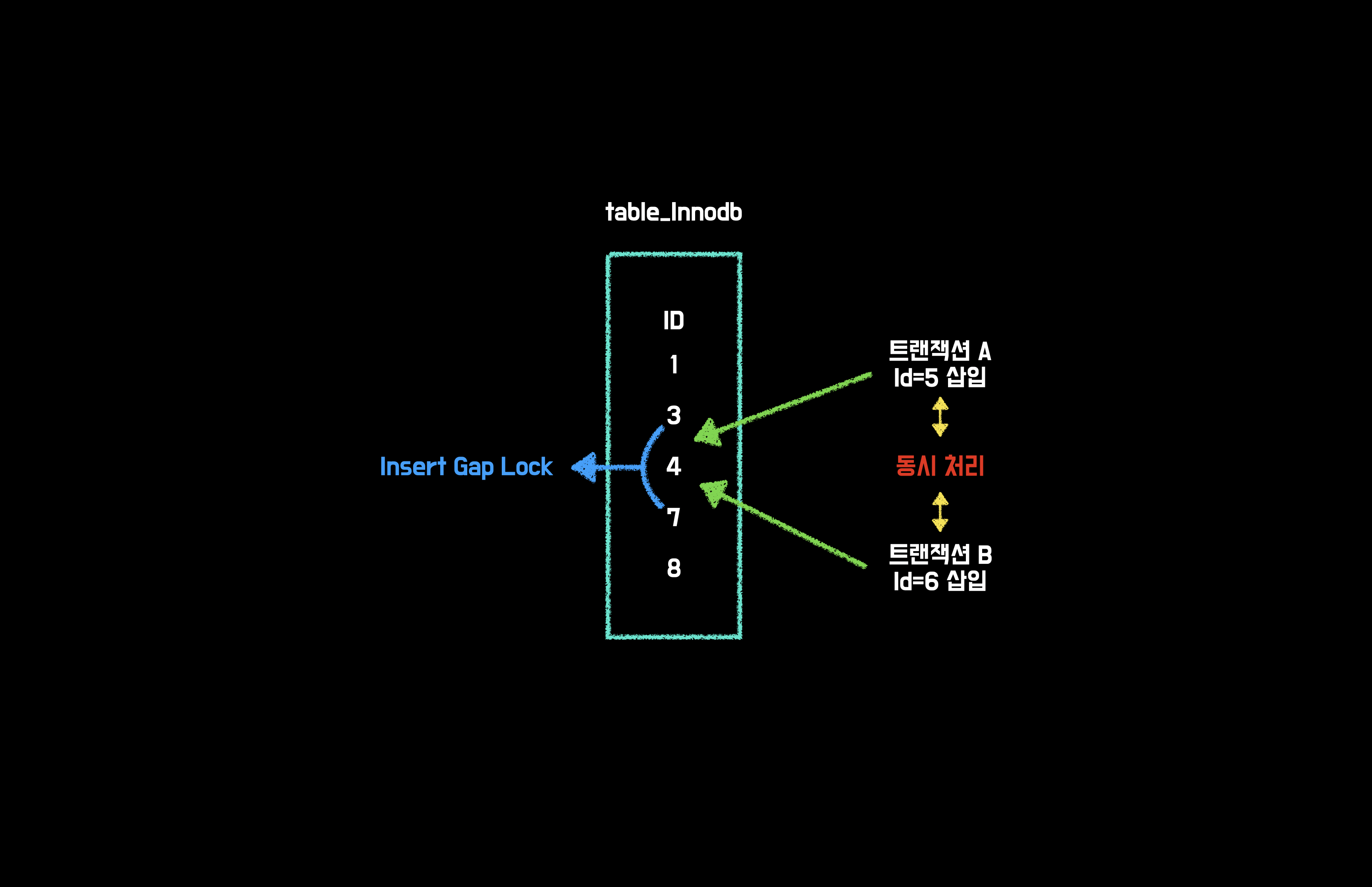 기본적인 갭 락 쿼리라면 트랜잭션 A가 id=5를 삽입하는 과정에서 이전 레코드인 3~7 사이에 갭 락이 걸릴 것이다. 트랜잭션 A를 처리하는 중 트랜잭션 B의 요청이 들어온다면 A가 커밋될 때 까지 대기해야하는 상황이 생긴다.