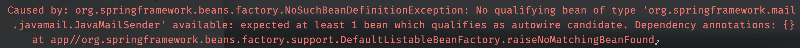 하지만 스프링 자체는 JavaMailSender라는 빈에 설정 값을 기반으로 빌드를 했기 때문에 아래와 같은 에러가 난 것 같다.
