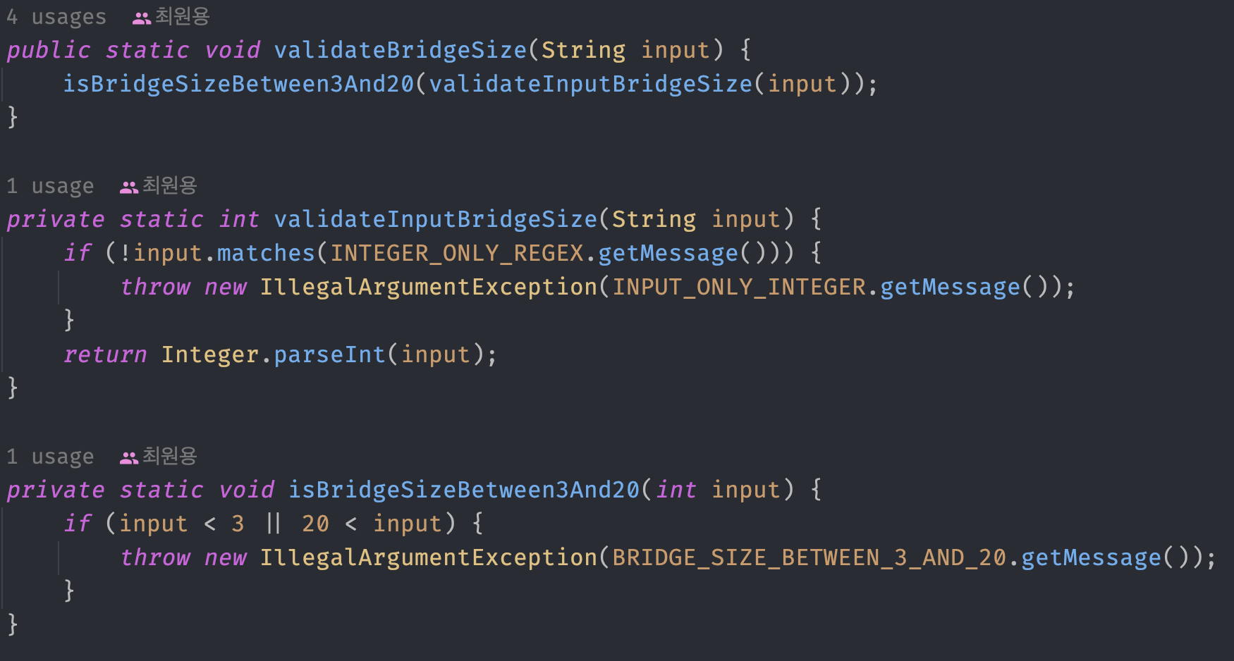 이 외에도 BridgeGame 클래스에서는 View(InputView, OutputView)와 관련된 기능을 직접적으로 사용할 수 없다는 것을 나중에 알아서 그것대로 리팩터링을 진행하기도 했다.