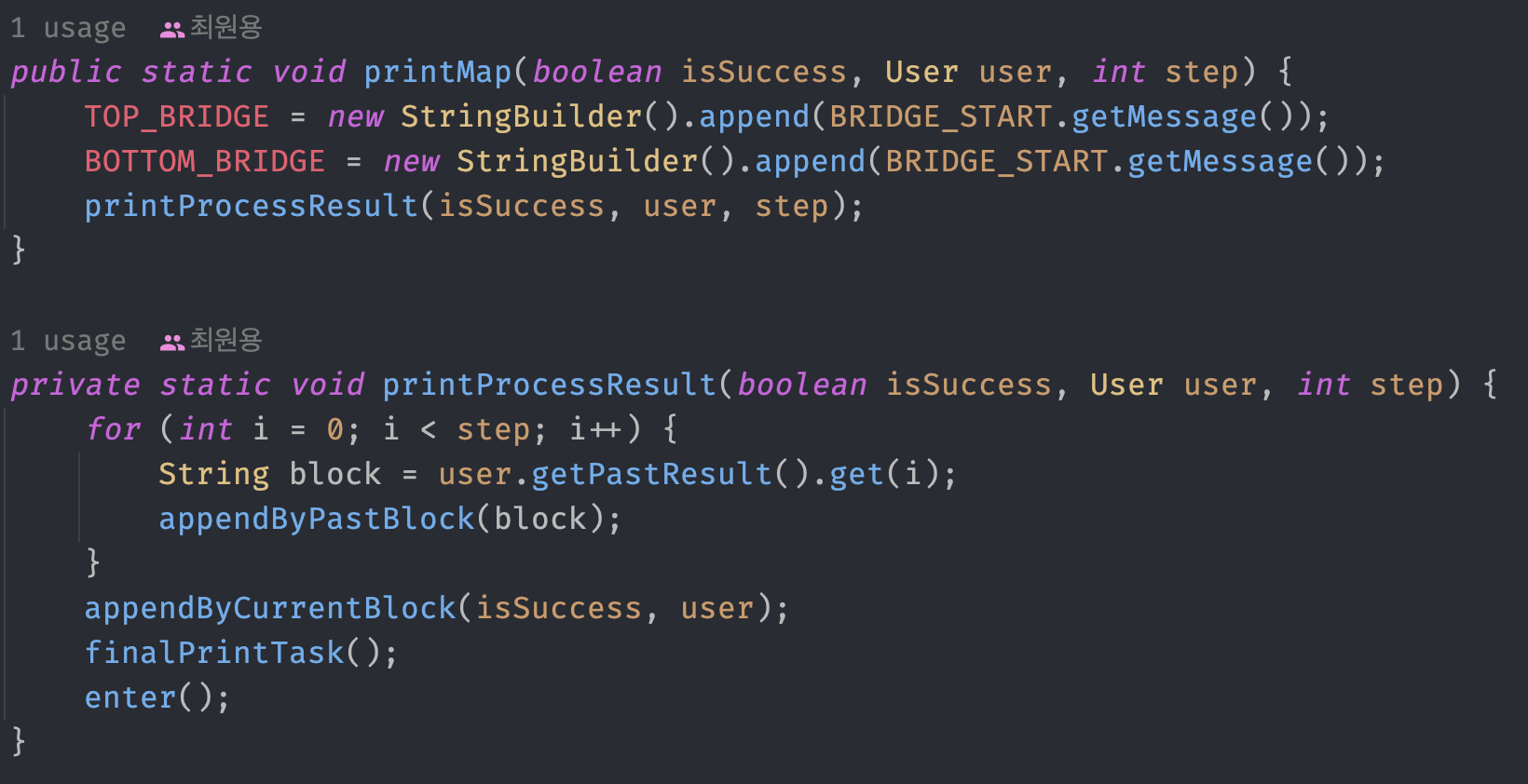 대략적인 다리를 출력하는 모습이다. 우선 printMap 메서드에서 지금 당장 건넌 다리가 성공인지 실패인지에 대한 파라미터, 유저의 정보, 현재 몇번 째 건너는 다리인지 step을 받는 모습이다.