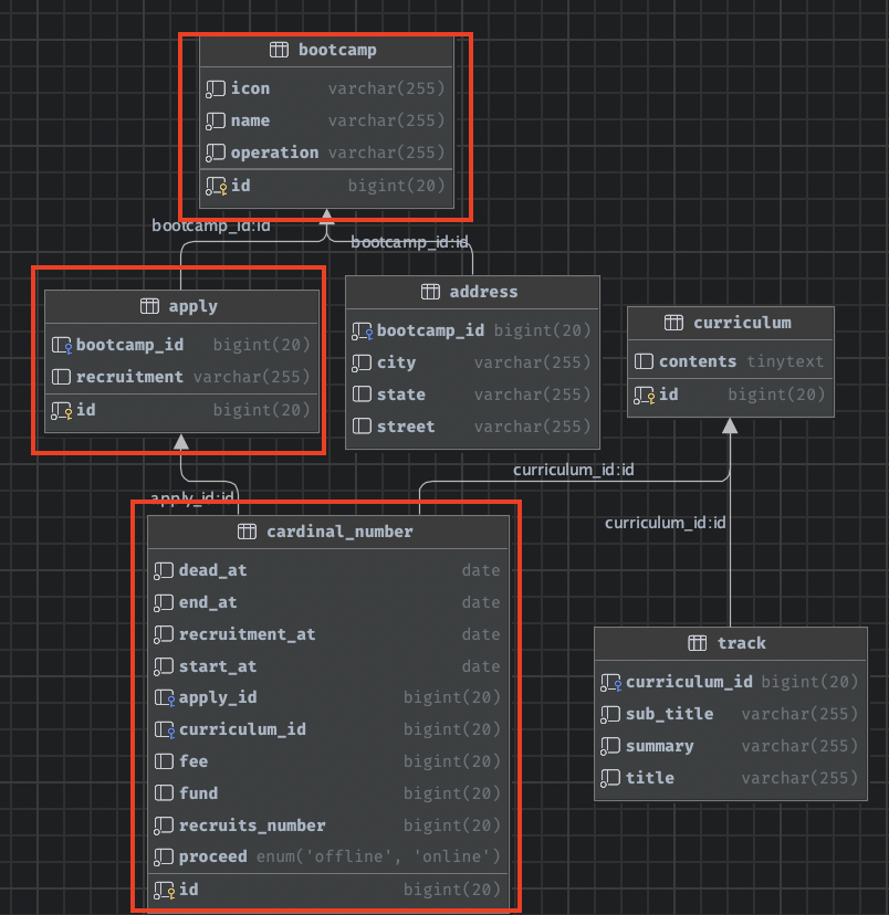 위 엔티티를 보면 다대일 관계의 Apply(N) : Bootcamp(1)와 Apply(1) : CardinalNumbers(N)의 관계가 있습니다. 필자는 Bootcamp의 Id를 입력받으면 그에 관련된 모든 정보를 반환하려고 합니다.