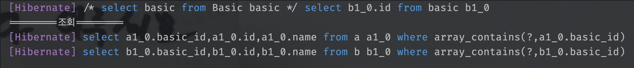 똑같은 쿼리를 실행했음에도, 실제로 실행된 추가 쿼리의 개수는 10배나 개선된 모습입니다.(20번 -> 2번) 아래의 where array_contains 구문이 batch_fetch_size를 사용함으로써 생긴 문법입니다.