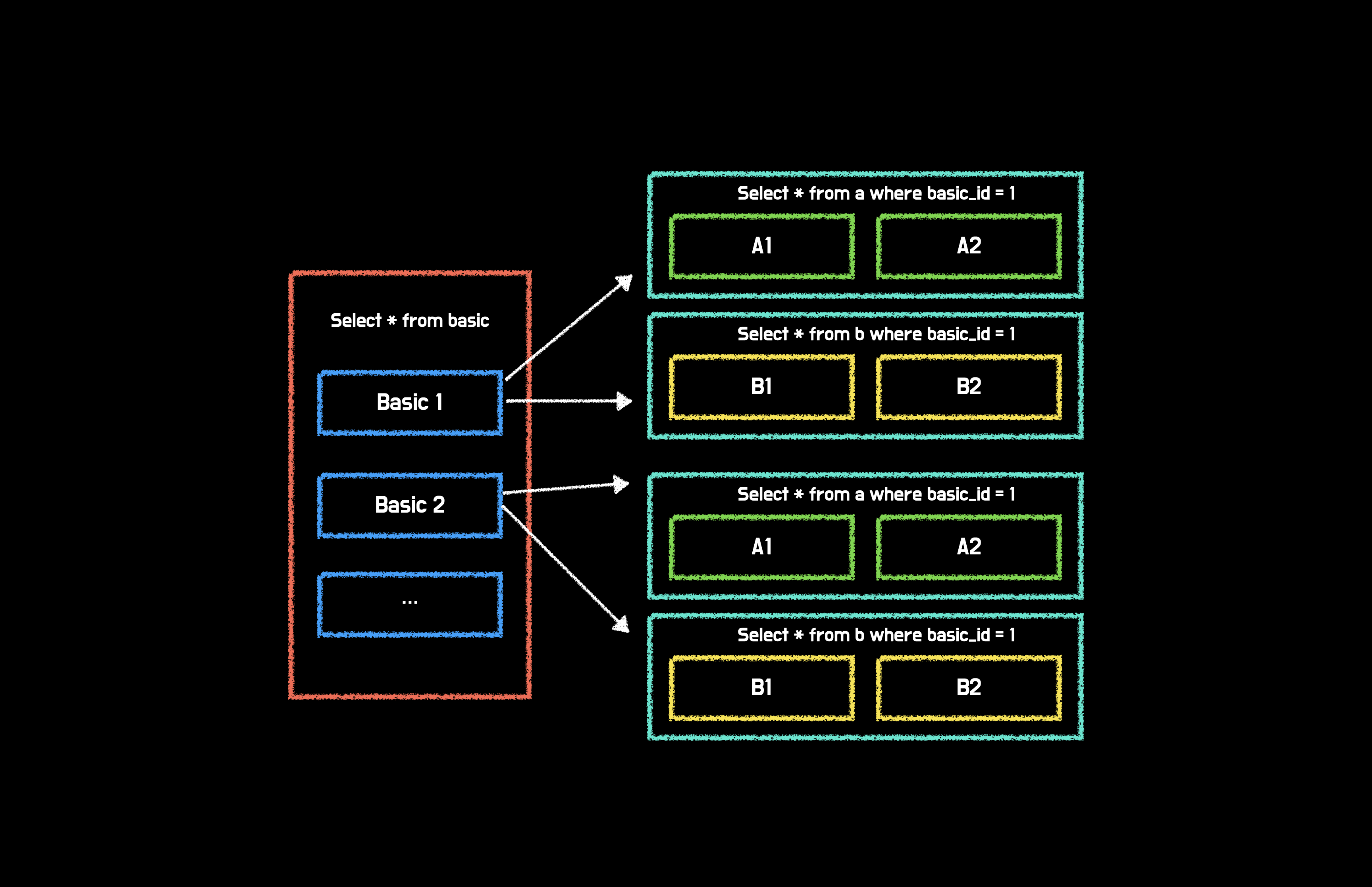 basic 1에서 a와 b를 각각 한 번씩 조회합니다. basic2에서도 마찬가지로 a와 b를 각각 한 번씩 더 조회하죠. 이렇듯 JPA에서 N+1이 발생하는 이유는 부모의 id를 key값으로 사용하기 때문입니다.