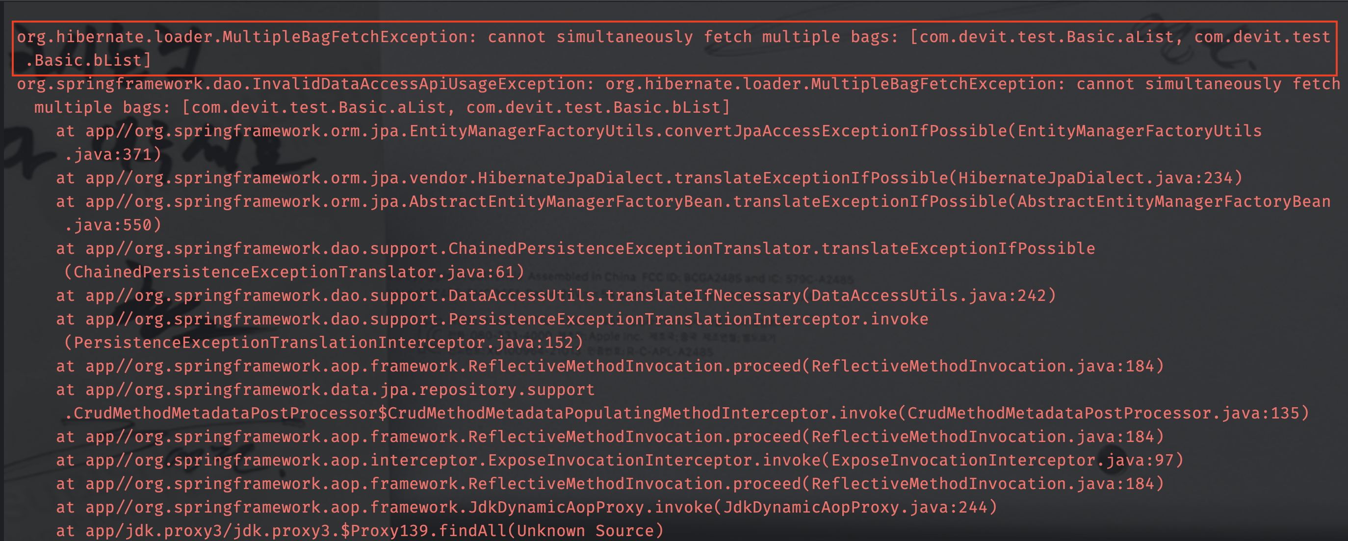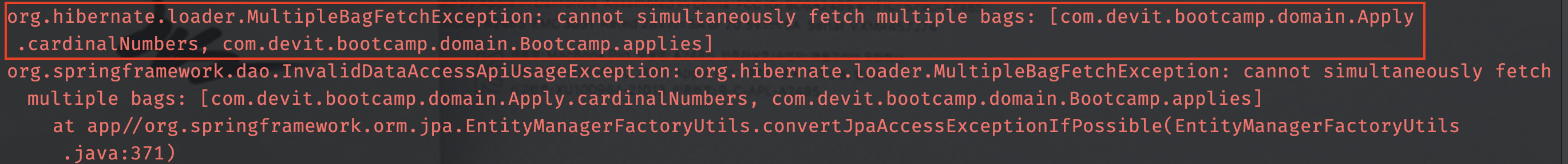 당연하게도 아래와 같은 에러 메시지가 뜨면서 실행되지 않습니다. 원인은 여러 개의 xToMany 관계에 대해서 fetch join을 실행해서 그렇겠죠. 그렇다면 체이닝 된 xToMany 관계의 N+1은 해결할 수 없는 걸까요?