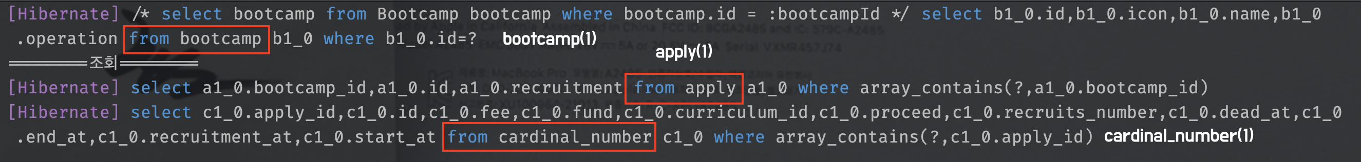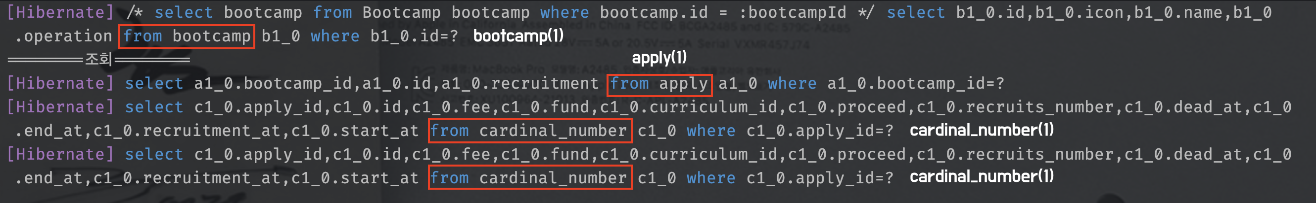 1(bootcamp) + N(apply(1), cardinal_number(2)) = 총 4번의 쿼리가 발생합니다. 위 문제를 해결하기 위해서 fetch join을 걸어보겠습니다.