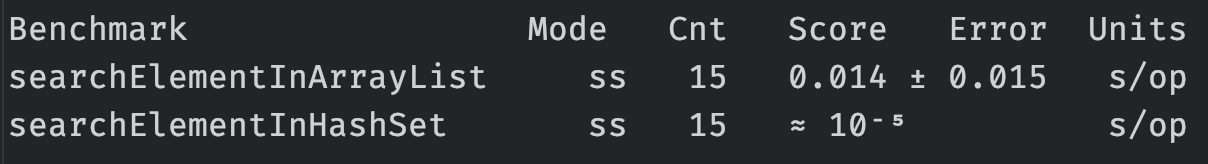 결과는 HashSet에서 데이터를 검색하는 것이 ArrayList에서 데이터를 검색하는 것보다 빠르다는 것을 보여준다. 이는 컬렉션의 요소를 빠르고 효율적인 방법으로 검색하려는 시나리오에서 HashSet이 더 효율적이라는 것을 확인할 수 있다.