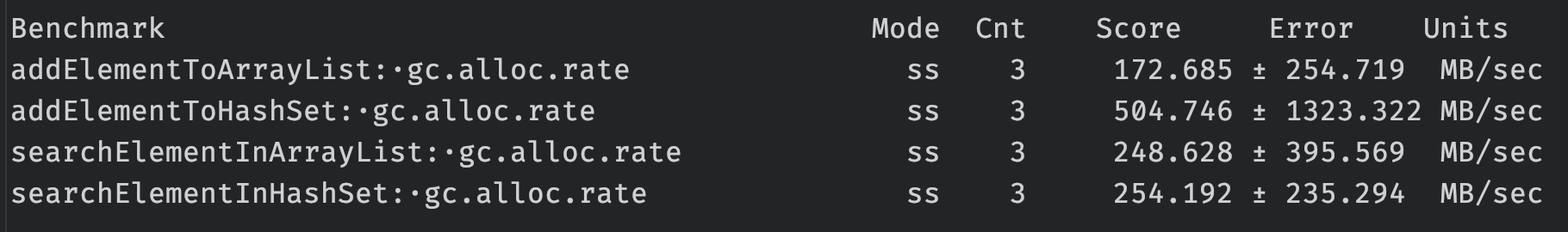 결과는 addElementToArrayList 메서드의 경우 약 172MB, addElementToHashSet 메서드의 경우 약 504MB으로 데이터 추가 작업은 HashSet이 ArrayList에 비해 실행 중 더 많은 메모리를 할당한다는 것을 의미한다. 또한 데이터 검색 작업도 HashSet이 ArrayList에 비해 검색 작업에 약간 더 많은 메모리를 할당한다는 것을 보여준다.