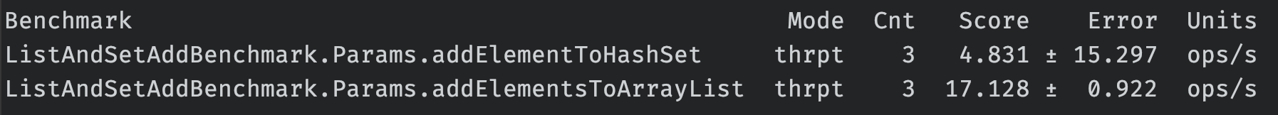 결과는 ArrayList에 데이터를 추가하는 것이 HashSet에 데이터를 추가하는 것보다 빠르다는 것을 보여준다. 또한 오차범위 또한 크게 차이 나기 때문에 가능한 한 빨리 컬렉션에 요소를 추가해야 하는 상황에서는 ArrayList가 더 효율적이라는 근거를 얻을 수 있다.