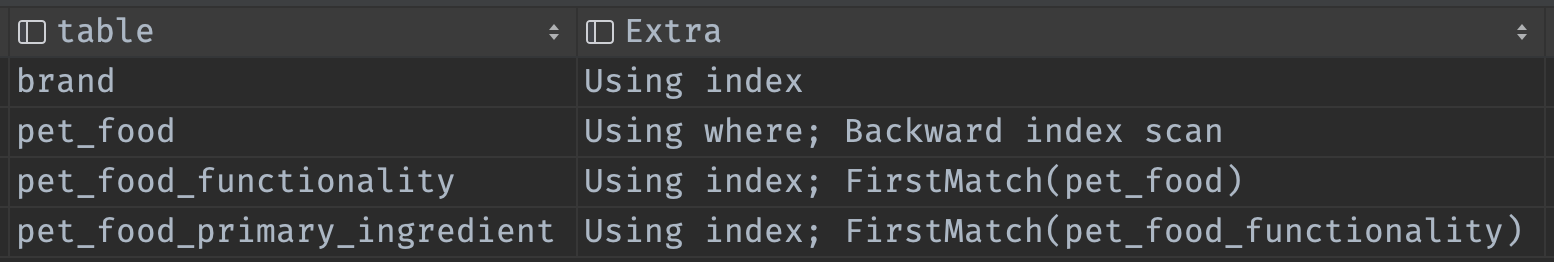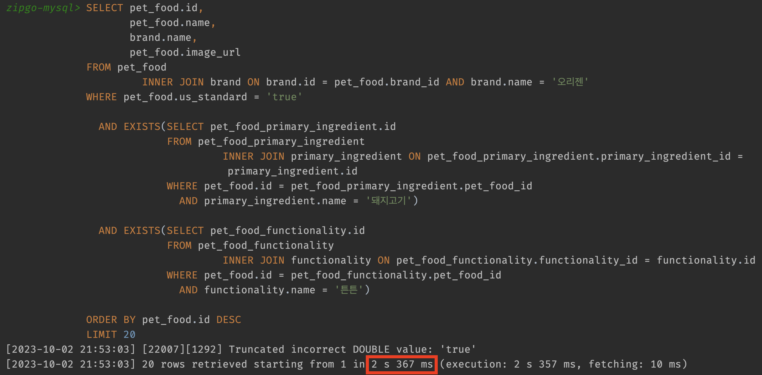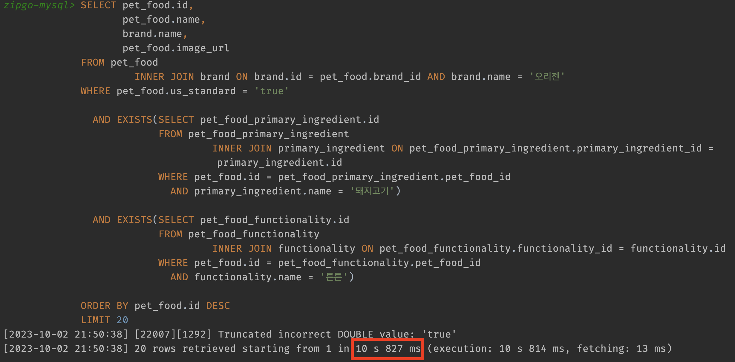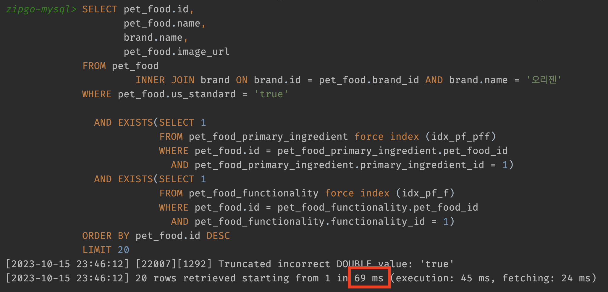 가장 큰 차이점은 기존 조인을 위해 사용했던 테이블 2개가 사라졌습니다. 또한 더 이상 주원료, 기능성 테이블을 사용하지 않기 때문에 복합 인덱스를 pet_food와 매핑 테이블의 pet_food_id로 설정했습니다. id를 비교하니 매핑 테이블에서 모든게 해결가능해지기 때문이죠. 그럼 쿼리는 몇 초만에 실행될까요?
