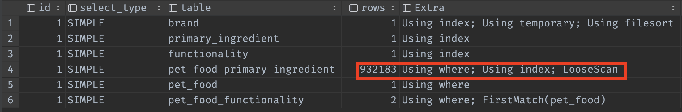 pet_food 100만건, 매핑 테이블 각각 200만건씩 존재하는 상황에서 복잡한 필터링 쿼리가 단 0.06초만에 조회가 완료되었습니다. 12초에서 0.06초면 정확히 200배 빨라졌습니다.