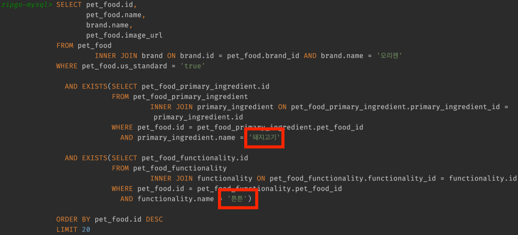 이번에는 id로 조회하는 방법을 살펴보려고 합니다. 현재 서브쿼리를 보시면 주원료와 기능성의 이름을 비교하고 있습니다. 즉 문자열을 비교하는 것이죠. 하지만 문자열이 아닌 id로 비교한다면 불필요한 조인을 할 필요도, 개선해야할 테이블도 없어집니다. 이제 id로 비교하면 어떤 결과가 나오는지 확인해보겠습니다.