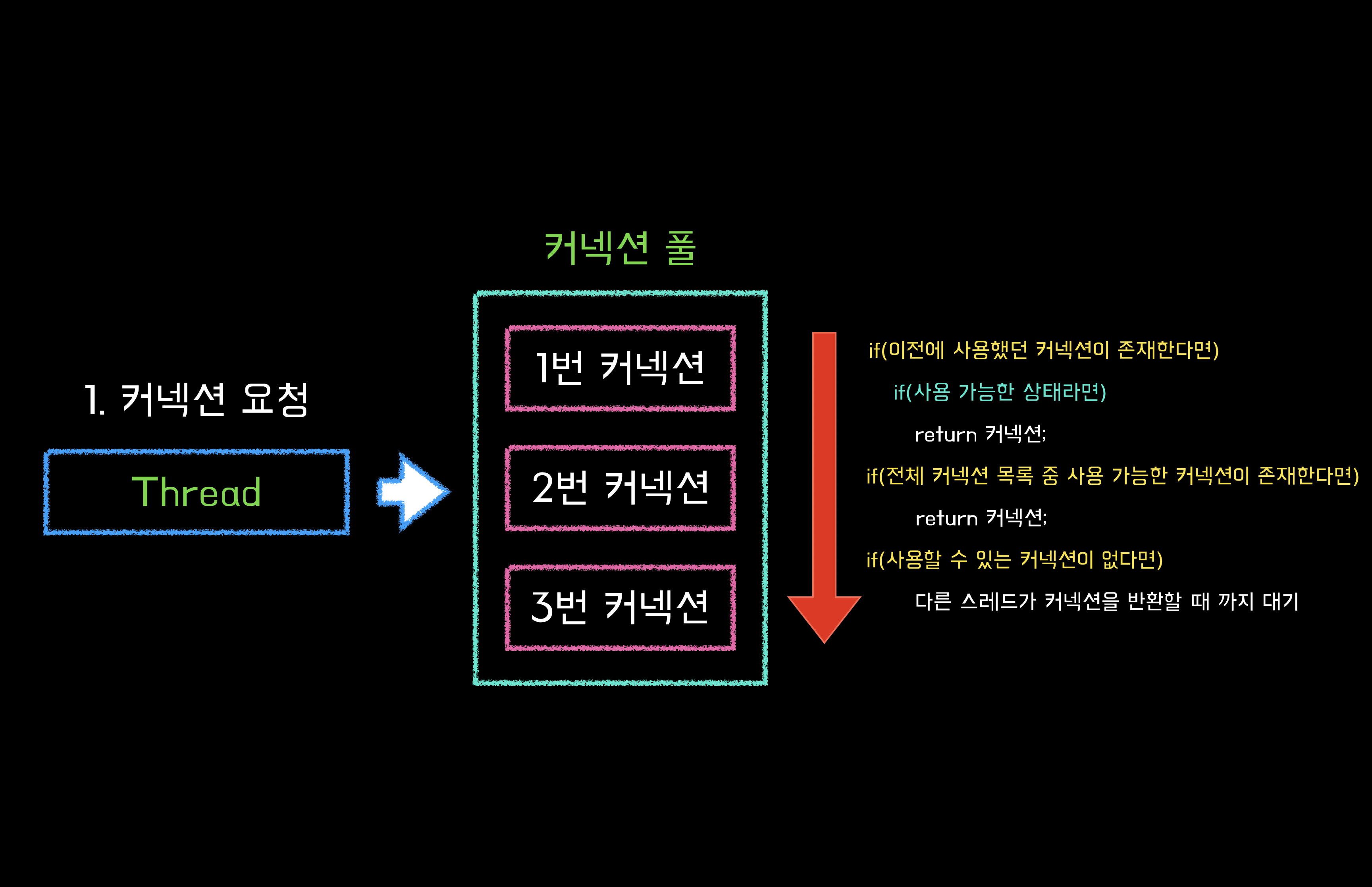 커넥션 풀은 데이터베이스와 연결된 커넥션을 미리 만들어 놓고 이를 pool로 관리하는 것입니다. 즉, 필요할 때마다 풀의 커넥션을 꺼내 사용하고 반환하는 기법입니다.
