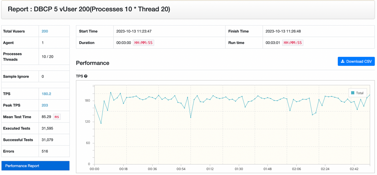 기본 커넥션 풀 사이즈(10)일 때 VUser 200 기준 TPS 140에서 병목 현상이 발생했습니다. 하지만 DBCP를 5로 변경한 뒤 부하테스트를 다시 진행했을 때 얻을 수 있는 결과는 다음과 같았습니다.