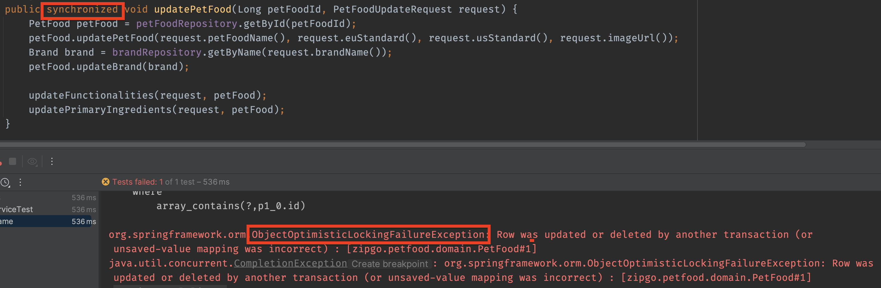synchronized를 사용하면 자원을 사용하고 있는 스레드의 작업이 끝날 때 까지 기다렸다가 다음 스레드가 실행되어 정상적으로 동작해야하는데, 여전히 메서드가 동시에 실행되어 StaleObjectStateException 예외가 발생하는 모습입니다. 분명 synchronized를 사용하면 하나의 스레드만 공유 자원을 점유할텐데 어떻게 이런 결과가 나올 수 있었던 걸까요?