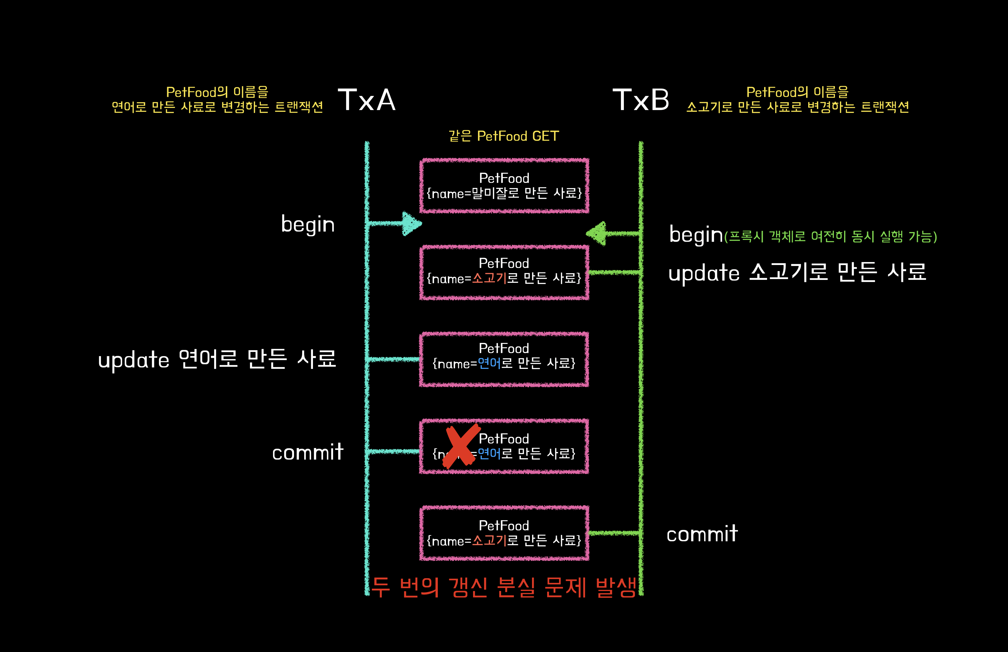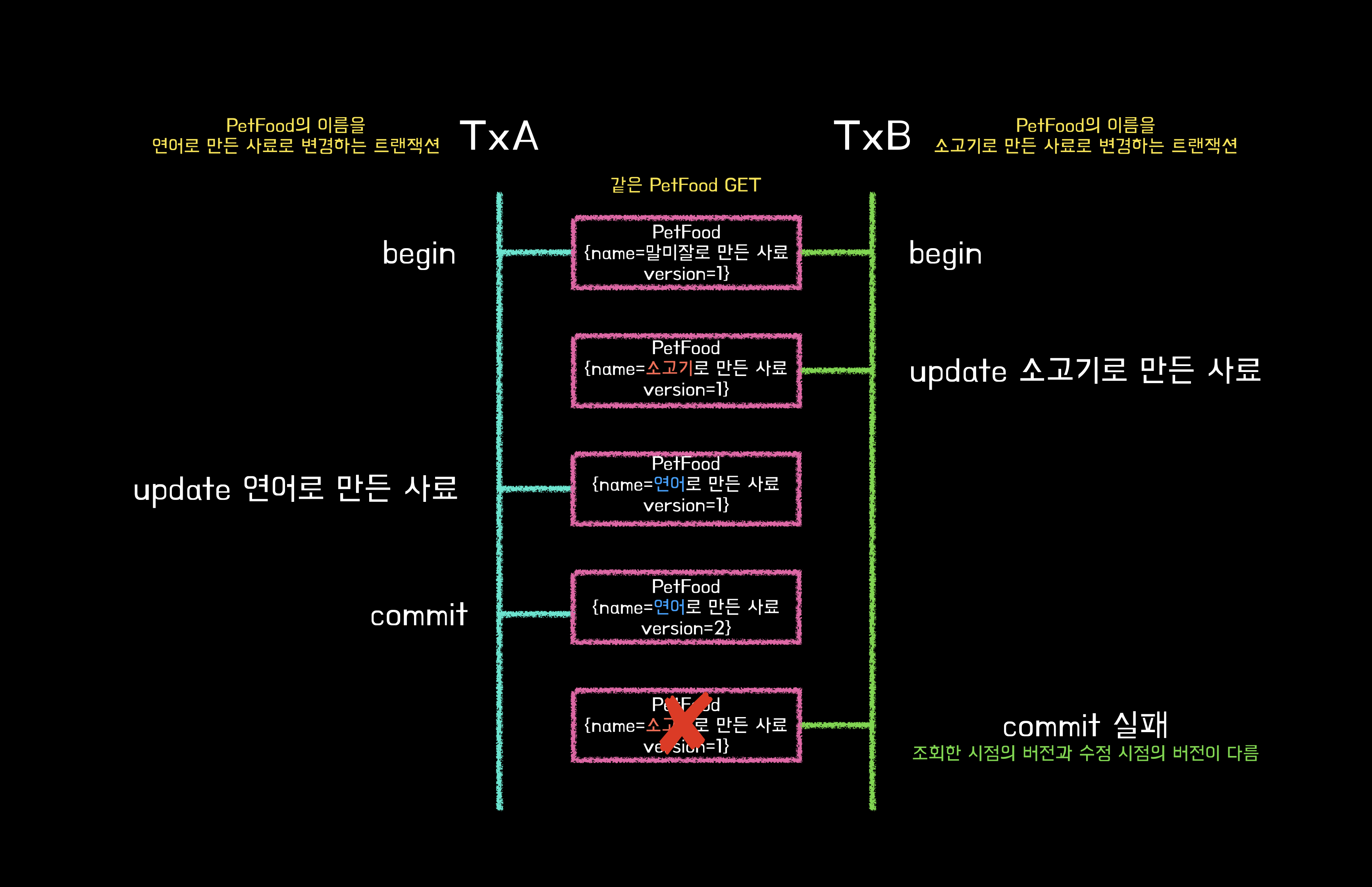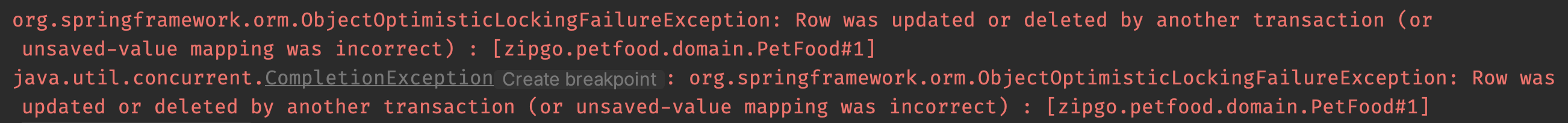 @Version 어노테이션을 적용했다면, PetFood 엔터티의 데이터가 변경될 때 마다 version 필드가 자동으로 1씩 증가합니다. 그리고 엔터티를 수정할 때 엔터티를 조회한 시점의 버전과 수정한 시점의 버전이 일치하지 않으면 ObjectOptimisticLockingFailureException이 발생합니다.