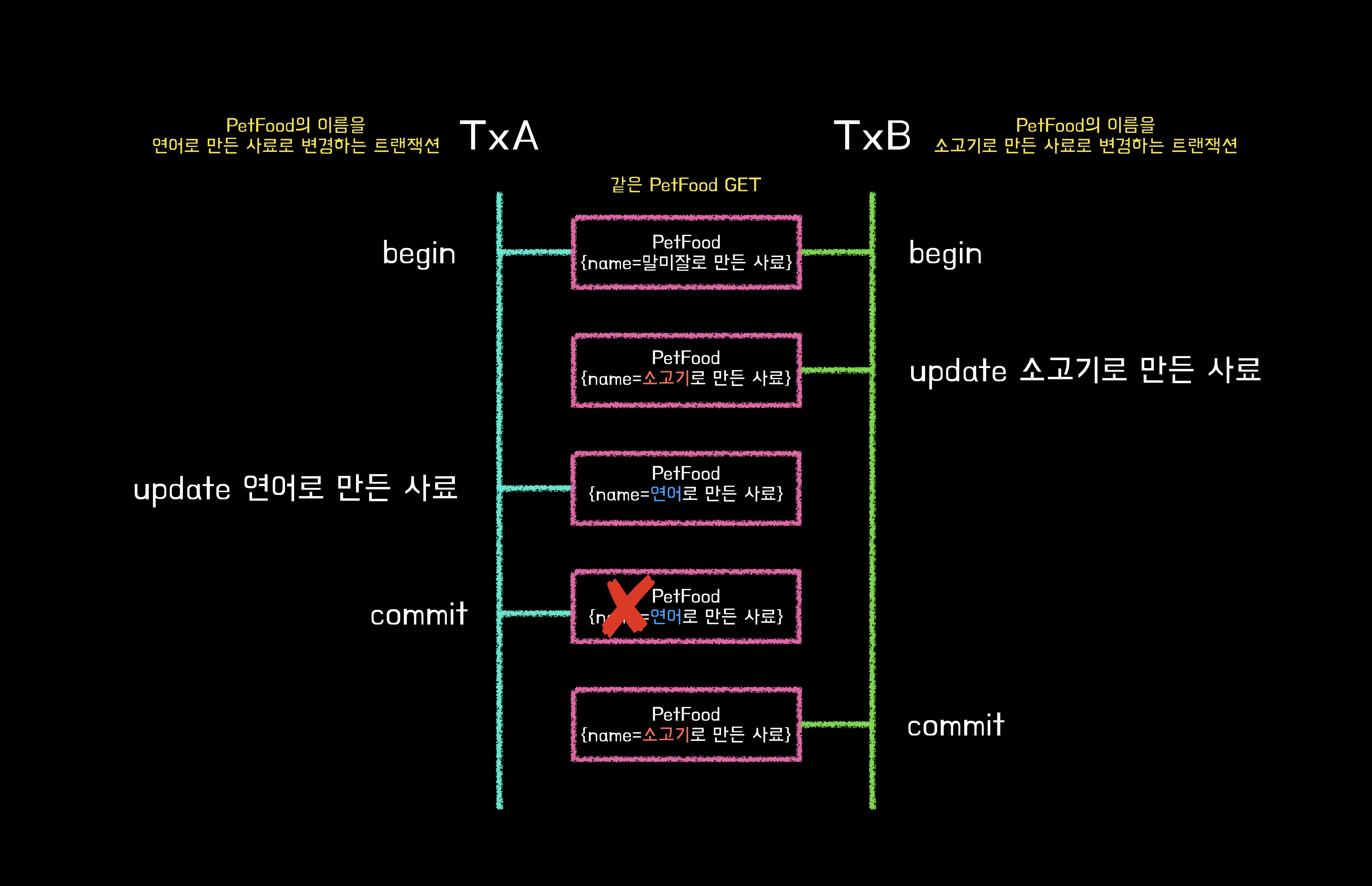 만약 트랜잭션의 충돌이 일어나 예외가 발생한다면 하나의 요청은 무시되었다는 뜻입니다. 지금과 같은 상황에서는 마지막 요청이 무시될것입니다. 하지만, 애플리케이션에서 처리하는 락이기 때문에, 마지막 요청이 버전 충돌으로 인한 예외로 요청이 실패할 경우 실패한 지점부터 재시도해야 합니다.