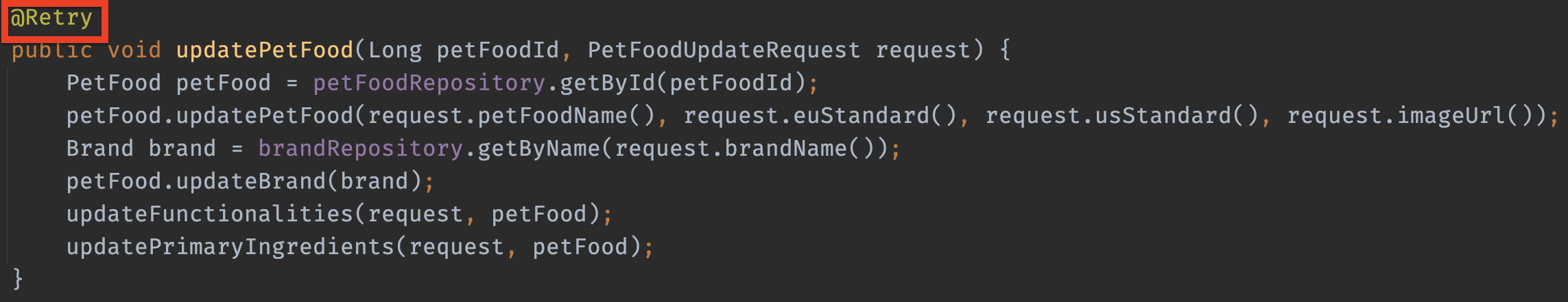 다음은 재시도 메서드를 구현해야 합니다. 주의사항은 아래와 같이 @Pointcut("@annotation(Retry)")를 사용하는 경우 @interface Retry 클래스와 RetryAspect 클래스가 같은 패키지에 존재해야 합니다.