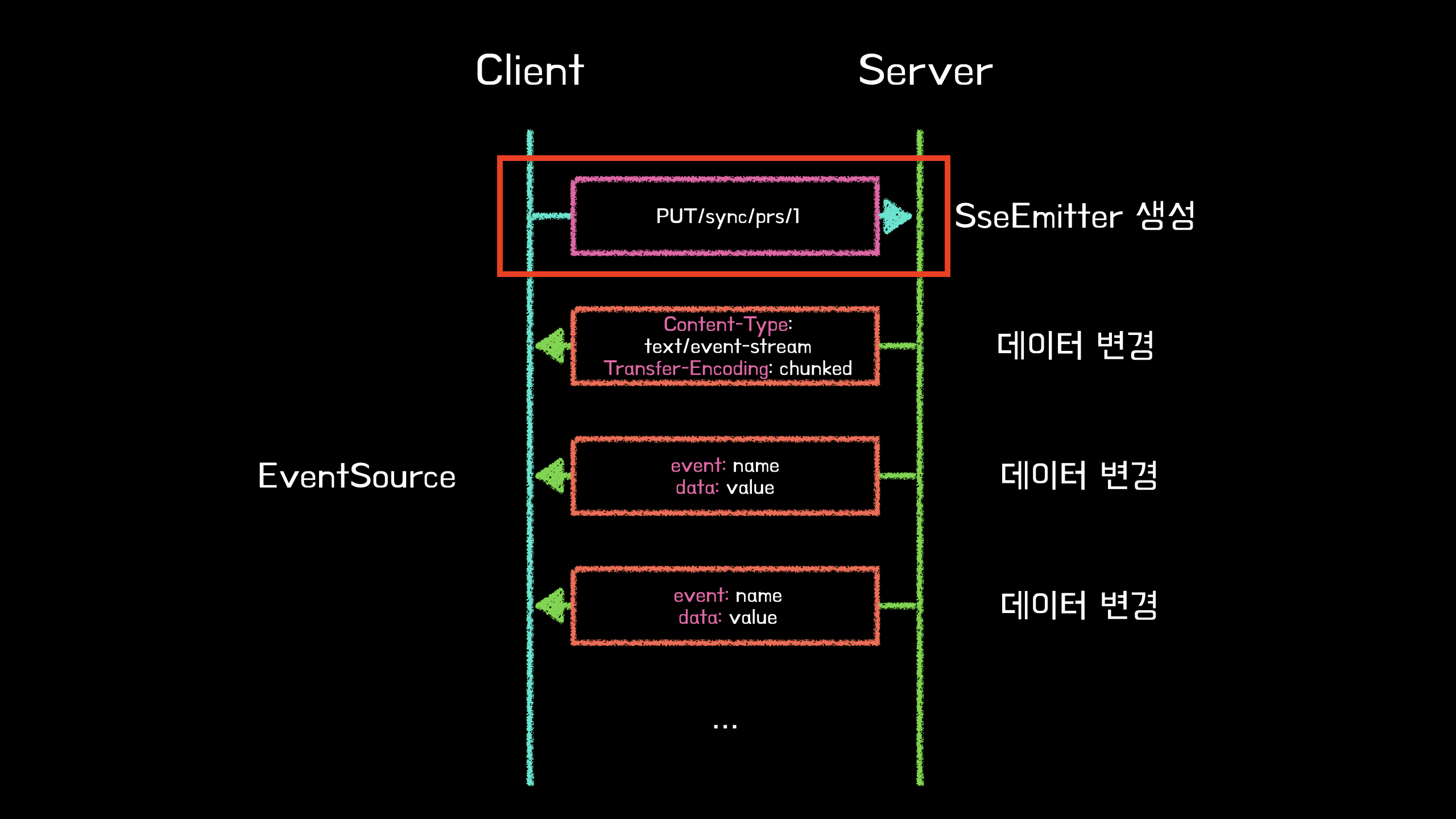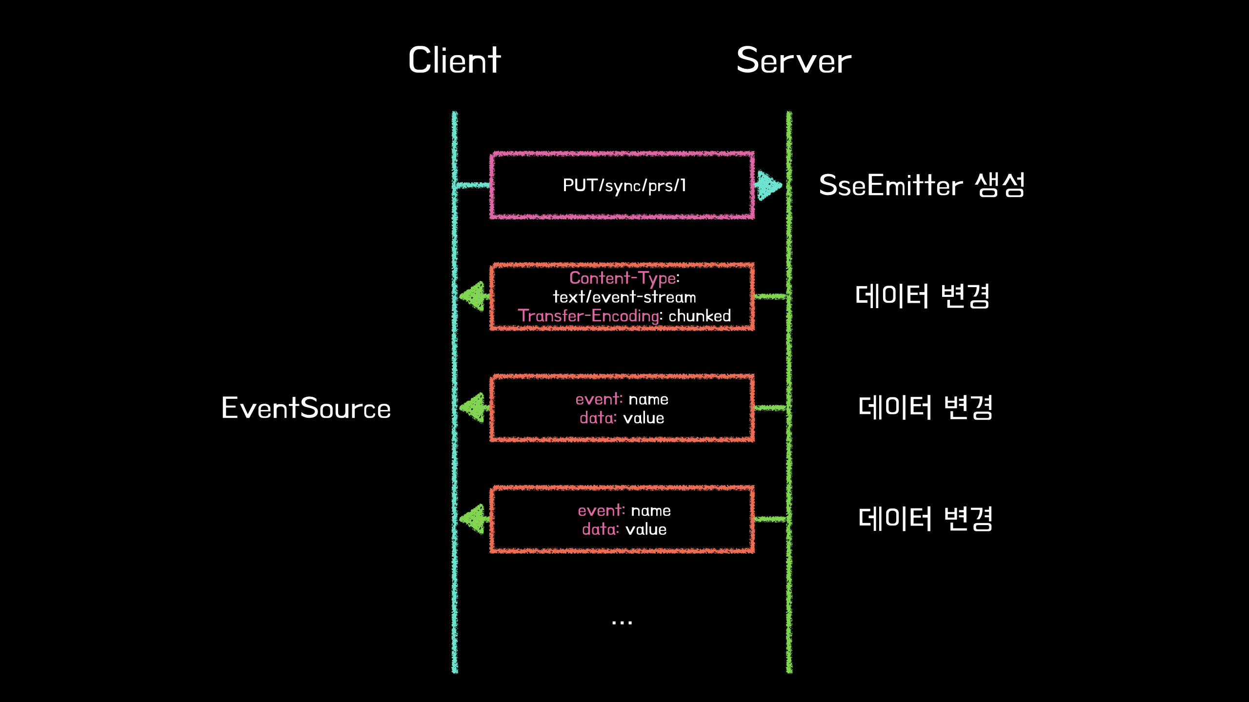 해당 프로젝트에서는 PR 수정/추가 상태가 실시간으로 반영되어야 하고 빈번하게 발생될 수 있는 상황이기 때문에 SSE를 선택하였습니다. SSE는 서버와 한 번 연결하고 나면 HTTP keep alive와 비슷하게 서버에서 변경이 일어날 때마다 데이터를 전송하는 방법입니다.