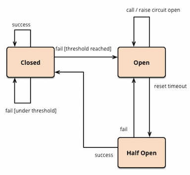 서킷 브레이커는 위 그림과 같은 상태 머신으로 나타낼 수 있습니다. 서킷 브레이크는 아래와 같은 총 3가지의 상태를 가지게 됩니다.