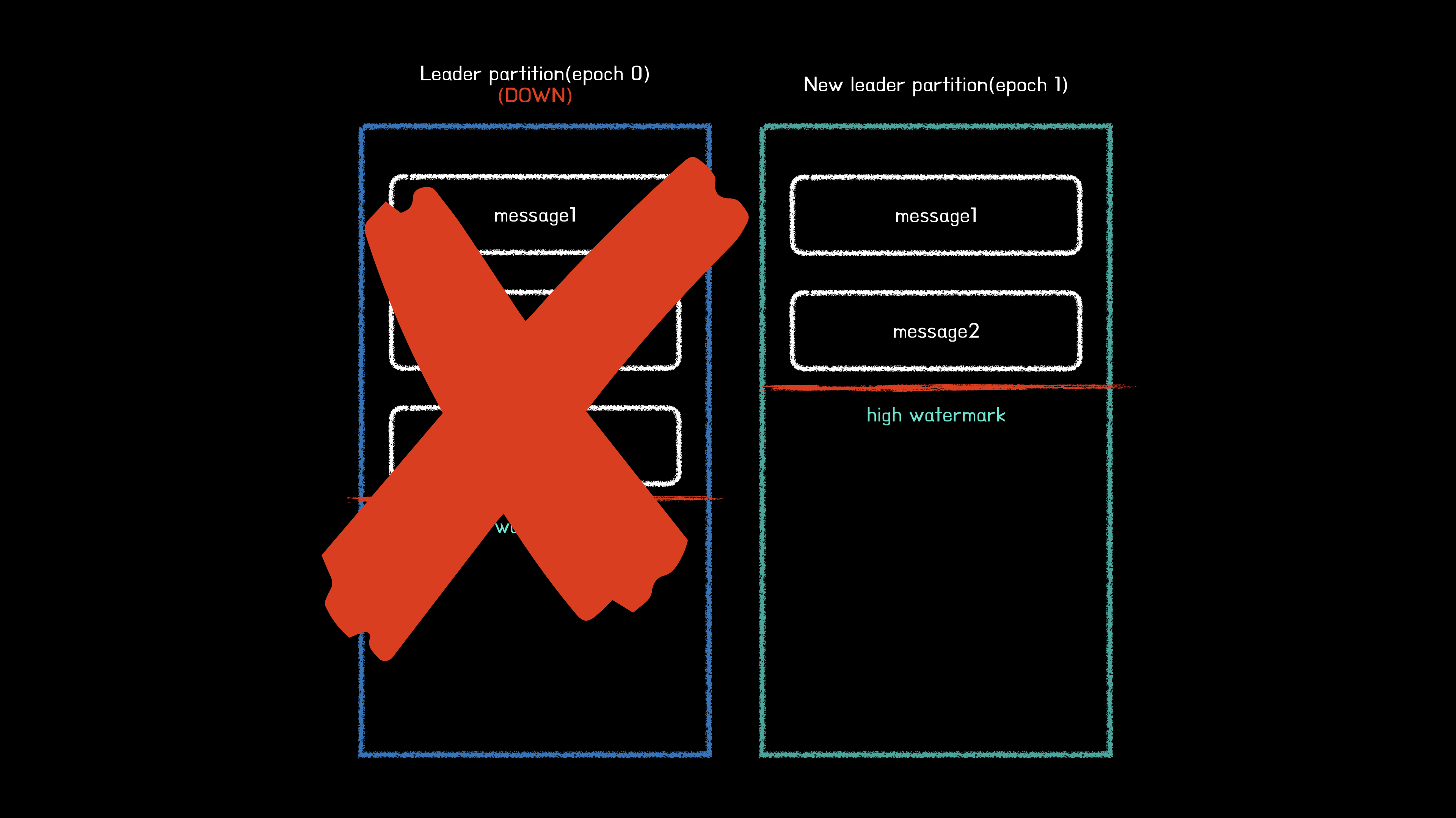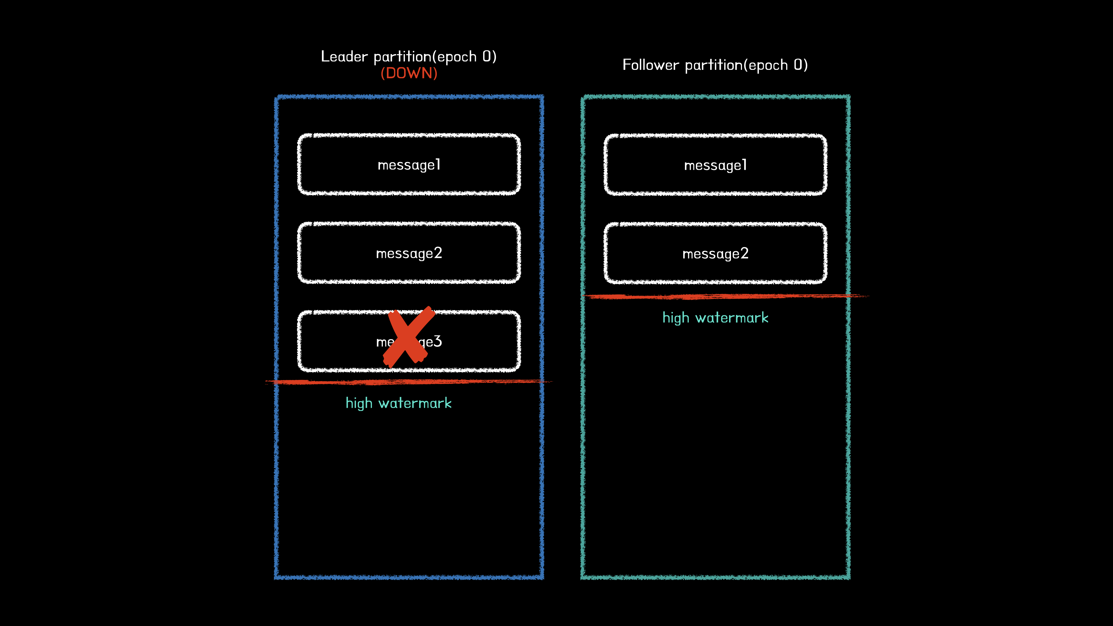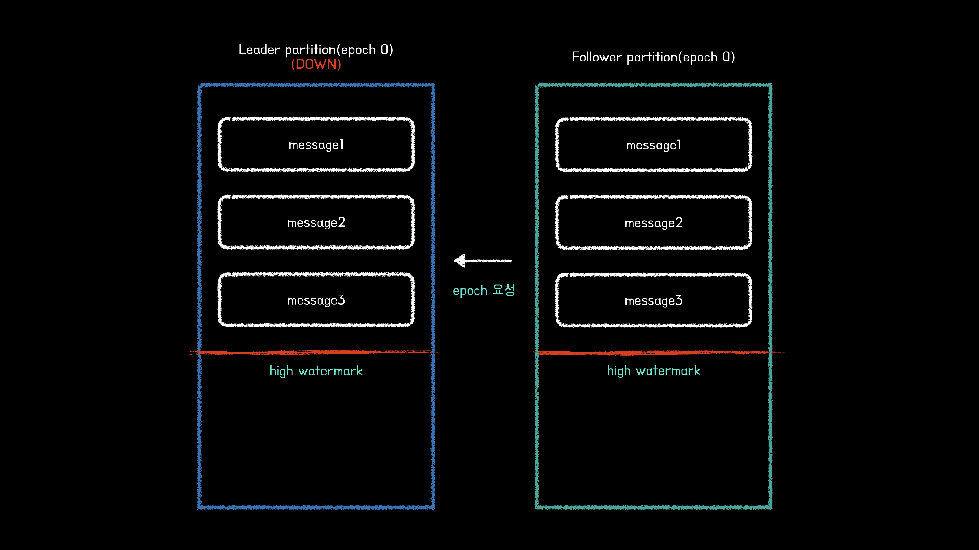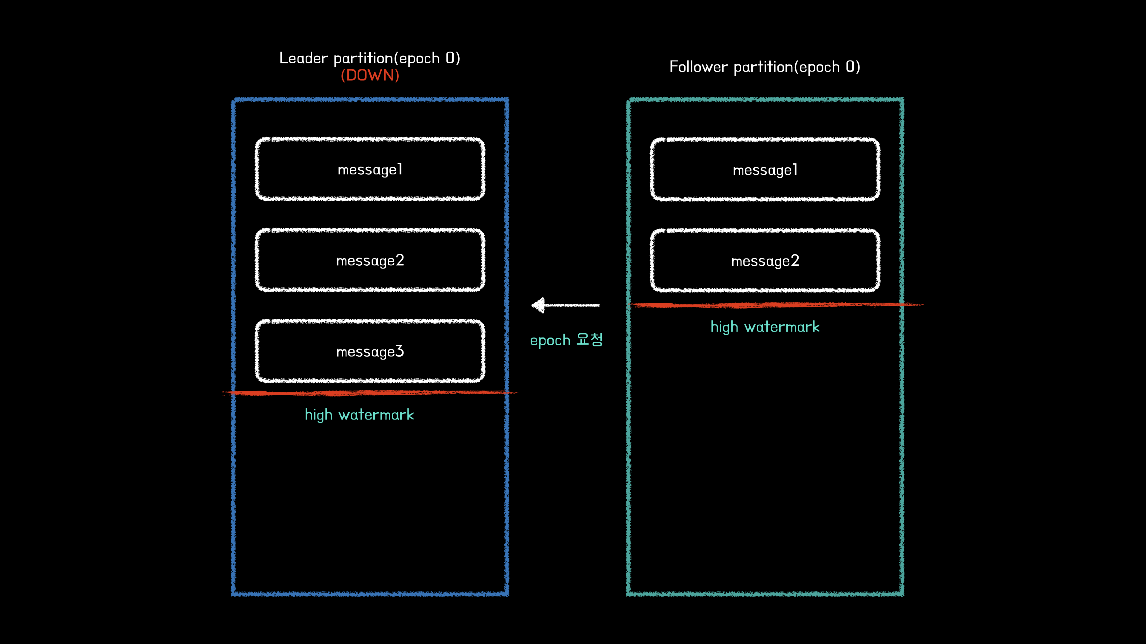 위 상황은 기존 리더 파티션의 하이워터마크가 메시지3(오프셋2)인 상태이지만, 팔로워의 하이워터마크가 메시지 2(오프셋 1)인 상태이다. 하지만 리더 에포크를 사용하지 않기 때문에 새로운 리더가 될 팔로워의 하이워터마크보다 높은 오프셋의 메시지는 삭제처리된다.