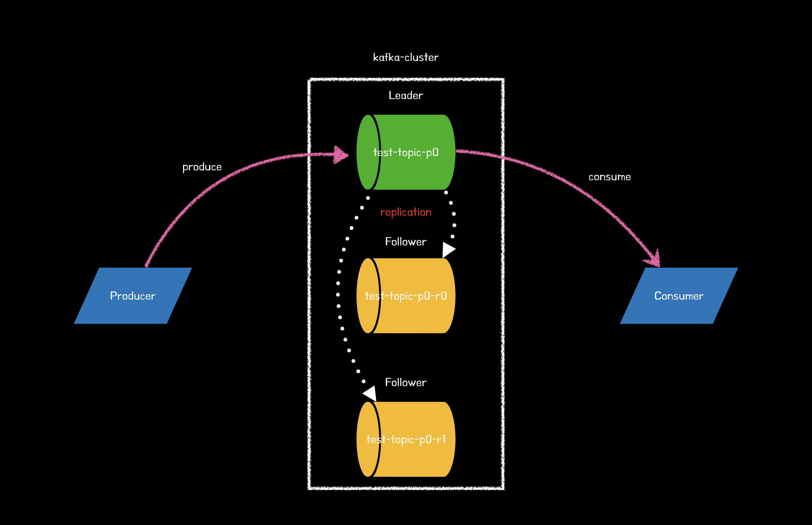 위 그림은 test-topic이라는 토픽의 파티션이 1개이고, 복제 개수는 3이다.(리더 브로커 포함) 또한 리더 파티션을 통해서만 프로듀스와 컨슘 작업을 진행하는 것을 볼 수 있다.