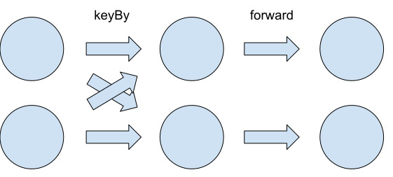 예를 들어 병렬 처리 수준을 2에서 3으로 변경하면, 기존 키 기반 채널 내의 레코드를 키 그룹 기준으로 새 채널에 재분배해야 한다. 키가 명시적으로 있는 경우엔 키 그룹을 기준으로 이 작업이 가능하지만, 순방향(forward) 채널에서는 키 컨텍스트가 존재하지 않기 때문에 레코드가 어떤 키 그룹에 속하는지 알 수 없어 순서를 보존할 수 없게 된다. 즉, 키 기반이 아닌 점별 연결의 경우 리스케일링 시 순서가 바뀔 수 있다는 점에 주의해야 한다.